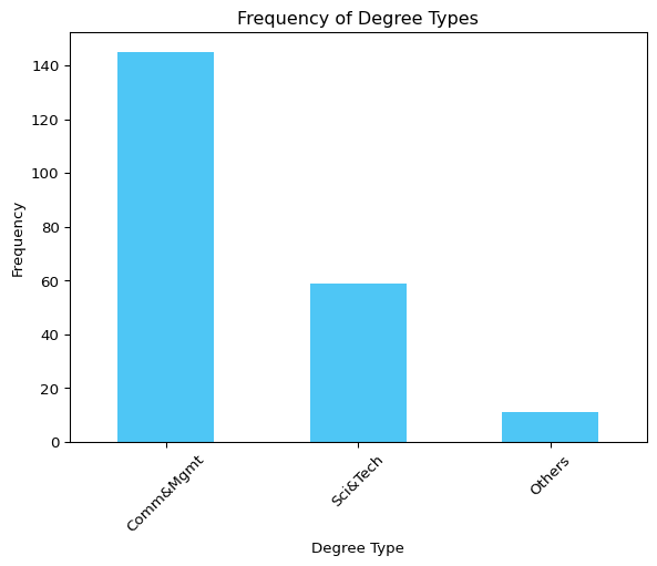import matplotlib.pyplot as plt# Plot the frequency of the original datasetreal_data["degree_type"].value_counts().plot(kind="bar", color="#03AFF1", alpha=0.7)plt.title("Frequency of Degree Types")plt.xlabel("Degree Type")plt.ylabel("Frequency")plt.xticks(rotation=45)plt.show()