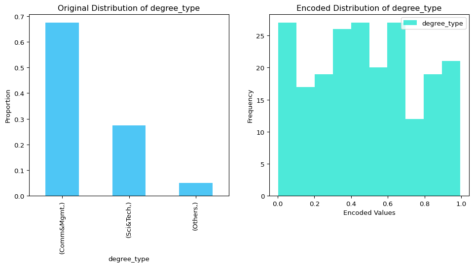 # Create a figure with two subplotsfig, (ax1, ax2) = plt.subplots(1, 2, figsize=(12, 5))# Plot the original distribution on the first subplotreal_data.value_counts(normalize=True).plot( kind="bar", color="#03AFF1", alpha=0.7, label="Original Data", ax=ax1)ax1.set_title("Original Distribution of degree_type")ax1.set_ylabel("Proportion")# Plot the encoded distribution on the second subplottransformed_data.plot( kind="hist", bins=10, color="#01E0C9", alpha=0.7, label="Encoded Data", ax=ax2)ax2.set_title("Encoded Distribution of degree_type")ax2.set_ylabel("Frequency")ax2.set_xlabel("Encoded Values")plt.show()